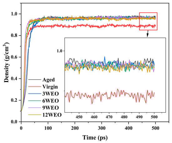 Molecular density is often considered a crucial metric for assessing the accuracy of simulation results [61]. Figure 5 illustrates the changes in density for various models under NPT simulations at 433.15 K. All of the models’ densities were observed to stabilize after the initial 75 ps. Hence, the average density calculated from 400 to 500 ps was deemed to accurately represent the asphalt molecule’s definitive density. This approach determined that the density of the virgin asphalt binder model was 0.889 g/cm3, while the aged asphalt binder model showed a density of 0.997 g/cm3. These values are considerably below those reported in the literature [62], which may be attributed to the elevated simulation temperature of 433.15 K. High temperatures can lead to thermal expansion and a resultant decrease in density, explaining why the modeled densities were lower than what is typically expected. The incorporation of WEO resulted in a decrease in the density of the aged asphalt binders. This reduction was particularly noticeable with the addition of 12% WEO, where the density reached its lowest at 0.958 g/cm3. WEO could compensate for the lack of lighter components in aged asphalt binders, thereby leading to a reduction in density.