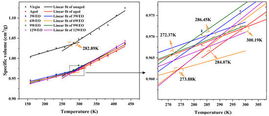 The glass transition temperature (Tg) plays a crucial role in defining the physical characteristics of asphalt materials, reflecting their performance under low-temperature conditions. In this study, the inverse of the densities of the asphalt models within different temperature ranges was linearly fitted. Tg was determined by identifying the temperature corresponding to the intersection point of adjacent fitted lines. NPT simulations of 300 ps were conducted on the virgin, aged, and WEO-regenerated asphalt models to assess the effect of WEO on restoring the glass transition behavior in aged asphalt. These simulations spanned a temperature range from 158.15 K to 433.15 K, with intervals of 25 K. The results, illustrated in Figure 6, were calculated based on the last 50 ps of the simulations.