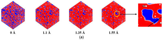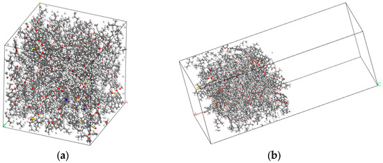 Surface free energy (γa) is an indicator of the crack resistance performance of asphalt binders. It refers to the energy necessary to create a new unit surface area of material under vacuum conditions [63]. Before calculating this value, the confined and bulk asphalt binder models needed to be established first. By setting a 50 Å vacuum layer in the OZ direction, the confined asphalt binder models no longer possessed periodicity. Figure 7 illustrates the aged asphalt binder’s γa model.