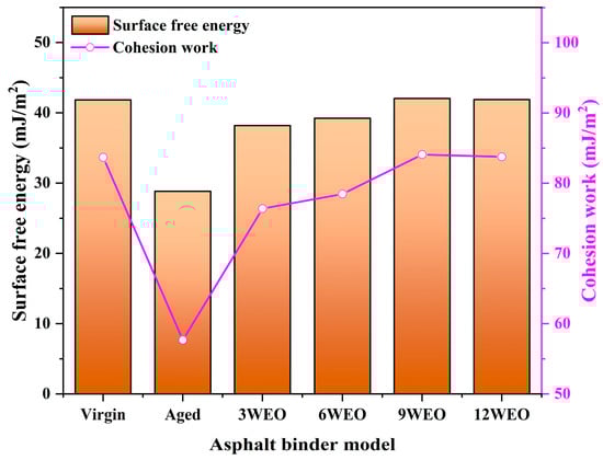 Figure 8 presents the γa and Waa values for different asphalt binder models. After aging, the γa and Waa values decreased significantly, showing a decline of 36.28% compared with the virgin asphalt binder model. This indicates that aging weakened the internal cohesion of the asphalt molecules, making them more prone to separation and, on a macroscopic level, making the asphalt binders more susceptible to cracking. Studies have shown that an increase in the asphaltene ratio is a crucial factor contributing to weakening cohesion within aged asphalt molecules. With the addition of WEO, the values of γa and Waa gradually increased. Introducing lighter components such as resin effectively could improve the γa and Waa values. When the WEO content reached 9%, it essentially restored to the level of virgin asphalt binder.
