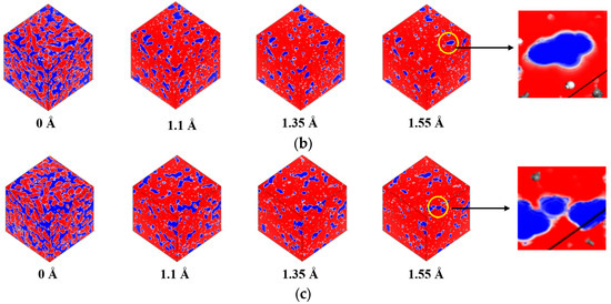 To investigate the size effects of probe atoms, this study selected three atomic probe radii: 1.1 Å, 1.35 Å, and 1.55 Å, representing hydrogen, carbon, and oxygen, respectively. Additionally, to obtain the Vfree of the asphalt model under ideal conditions, a probe with a radius of 0 Å was also used. The calculations also considered room temperature to be 298.15 K and the mixing temperature to be 433.15 K to examine the impact of temperature on the FFV. Figure 9 displays the distribution of Vfree and Voccupied in the virgin asphalt binder model, aged asphalt binder model, and aged asphalt binder model with 12% WEO at 433.15 K using different probe atoms.
