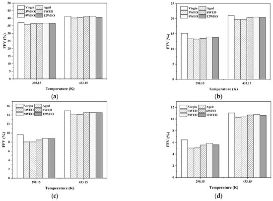 Figure 10 depicts that WEO can increase the FFV of aged asphalt molecules. This is attributed to the presence of chain alkanes in WEO, which can create certain void spaces within the molecular structure. Simultaneously, WEO introduces new aromatic compounds whose π-π stacking interactions can make the molecular packing denser, ultimately improving the FFV of aged asphalt molecules. With an increase in the probe radius, the detection range gradually decreased, leading to a downward trend in the FFV. However, the FFV increased with the rising temperature, which is consistent with the result that asphalt binder flows and diffuses more easily at higher temperatures [67].