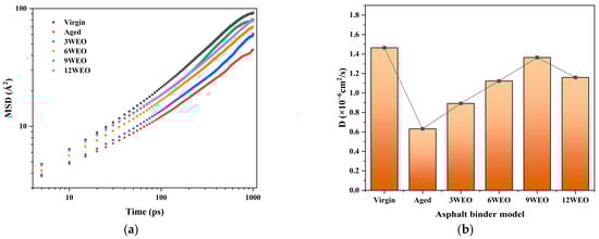 Figure 12 calculates the D values for each asphalt binder model. The D value for the aged asphalt binder model was only 39.58% of that of the virgin asphalt binder model. The most significant recovery of D was observed with the addition of 9% WEO, reaching 93.17% of the virgin asphalt binder model’s value. However, achieving 100% diffusion was not possible due to limitations in molecular compatibility and simulation constraints. As the WEO content increased, the recovery rate of D slowed down, especially when the WEO content reached 12%, at which point its D value decreased. This finding aligns with previously published research in the literature [55].