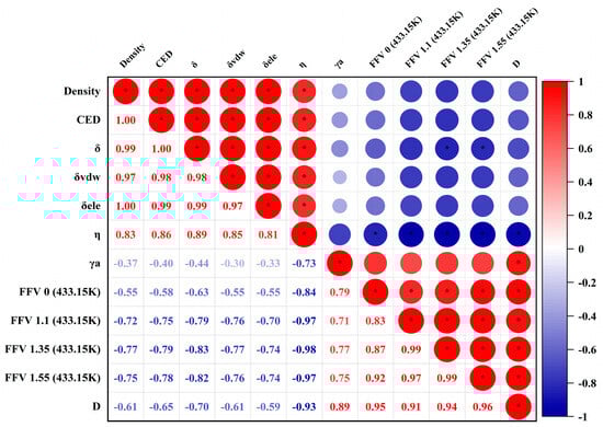 Figure 12 presents a heatmap of correlation coefficients detailing the interrelationships among various parameters within the computational analysis. It explores how these parameters interacted and potentially influenced each other. A pronounced positive correlation existed between the density and parameters like the CED, δ, δvdw, and δele, as evidenced by the intense red coloration and coefficient values approaching 1.0. The property η displayed a moderate-to-strong positive correlation with the density, CED, δ, δvdw, and δele, underscored by the red hues and values surpassing 0.8. In contrast, the γa showed a pronounced negative correlation with the FFV across different probe radii. Notably, the D value correlated quite strongly and positively with the FFV at probe radii of 1.35 and 1.55 Å while inversely correlating with the γa. This pattern suggests that increased FFVs at specified probe radii are indicative of elevated diffusion rates.