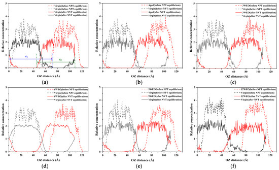 Figure 13 shows the R values of the virgin asphalt binder model at 433.15 K when mixed with another virgin asphalt binder model, an aged asphalt binder model, and aged asphalt binder models with varying WEO contents to form blended systems. Initially, gaps existed between the asphalt molecules, but these gaps disappeared after 500 ps of NVT equilibration. At the same time, the peak values decreased, and the area of overlap in the relative concentration increased, suggesting enhanced molecular integration. Incorporating aged asphalt binder reduced the overlap range with the virgin asphalt binder, shrinking from 45–71 Å to 47–65 Å. However, as the amount of WEO increased, the overlap range gradually expanded, with their ranges being 45–64 Å, 34–66 Å, 43–67 Å, 32–71 Å, and 28–82 Å. This suggests that WEO promotes integration between aged and virgin asphalt molecules.