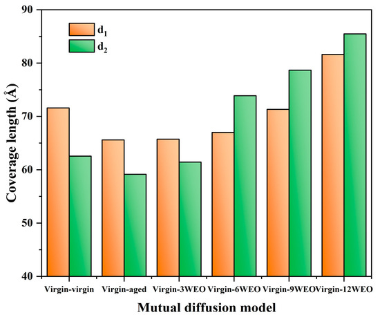 To assess the diffusion behavior of asphalt molecules within the blended systems, d1, and d2 are defined to represent the coverage lengths of the two molecular types present in the system. Figure 13a marks the respective coverage lengths of two virgin asphalt molecules. The calculated coverage lengths of different asphalt molecules under various fusion systems are shown in Figure 14. When the virgin asphalt molecule was mixed with the aged asphalt molecule, as opposed to mixing with itself, there was a decrease in the virgin asphalt molecule’s coverage length. This reduction is attributed to the compositional differences between the new and aged asphalt molecules, which diminished their ability to diffuse effectively. This phenomenon predominantly showed the virgin asphalt molecule diffusing toward the aged asphalt molecule. As the WEO content increased from 3% to 12%, the coverage length of the virgin asphalt molecules increased by 0.21%, 2.12%, 8.72%, and 24.41%, while the coverage length of the aged asphalt molecules increased by 3.89%, 24.92%, 33.04%, and 44.54%, respectively. Due to the addition of virgin asphalt binder, the concentration of the WEO molecules within the entire blended system was reduced. These findings suggest that as the WEO content increases, the effect of WEO on enhancing the diffusion of aged asphalt molecules into virgin asphalt molecules becomes more pronounced.