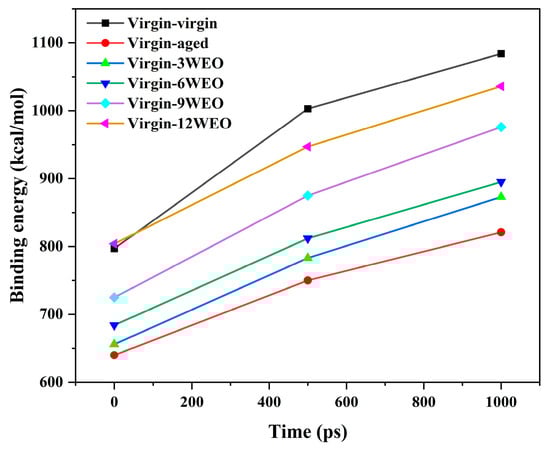 Figure 15 presents the binding energies at the onset (0 ps), midpoint (500 ps), and conclusion (1 ns) of NVT equilibration in the mutual diffusion models. The binding energies were consistently positive throughout these stages, indicating attractive forces between the molecules. The binding energy between the virgin and aged asphalt binders showed a 28.28% increase over time. However, in contrast to the self-blended virgin asphalt binder model, the binding energy between the aged and virgin asphalt binders decreased. This decrease is attributed to the presence of aged asphalt binder, which increases electrostatic interactions between molecules, preventing full integration between the virgin and aged asphalt binders. The incorporation of WEO led to increases in the binding energy at 1 ns by 6.33%, 9.01%, 10.35%, and 26.19% for different WEO contents compared with the mixture without WEO. Significantly, introducing 12% WEO into the aged asphalt binder at 0 ps achieved a binding energy surpassing that of the virgin asphalt binder blended with itself. However, as the equilibration process unfolded, this binding energy diminished, ultimately falling below the level observed in the self-blended virgin asphalt binder model. Although WEO could improve the binding energy, it still performed worse than the self-blended virgin asphalt binder model. As the simulation time increased, the growth rate of the binding energy in each model decreased, highlighting that mechanical stirring is necessary for more thorough mixing of the virgin and aged asphalt binders.