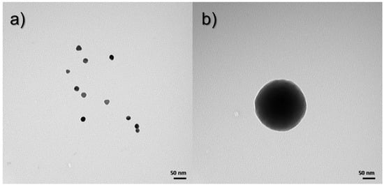 TEM images were taken to determine the morphology of the obtained nanoparticles and nanocomposites. Figure 3a shows an image taken of gold nanoparticles, which have a uniform, spherical shape, and the size oscillates between 20 and 25 nm. On the other hand, Figure 3b shows a silica nanoparticle, whose shape is spherical, and the size varies up to 250 nm.