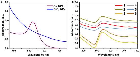 Figure 4 shows the absorption spectra for all synthesized samples. The spectra for Au NPs and SiO2 NPs are included in Figure 4a. In the case of gold nanoparticles, the absorption maximum is observed at a wavelength of 530 nm [26]. The same figure also shows the spectrum of silica nanoparticles, for which the maximum absorption in this range was not observed [27]. For the materials, in which the surface of gold nanoparticles is coated with a silica shell, the absorption spectra (Figure 4b) show an absorption maximum in the range of 540–550 nm, which confirms the presence of gold nanoparticles in the samples. Moreover, this range is shifted towards longer wavelengths, which is attributed to the effect of the shell consisting of silica nanoparticles on the structure [28].