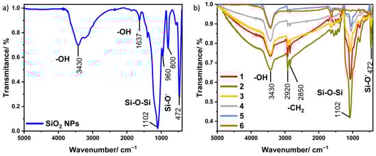 Fourier transform infrared spectroscopy is an analytical technique used to study the molecular structures of the obtained materials. The obtained spectra allow the identification of individual functional groups and, thus, the analysis of the chemical compound. Furthermore, this method allows the detection of functional groups located on the surface of a given material. Figure 5a shows the FT-IR spectrum for silica nanoparticles, which contain several characteristic bands. The band with the maximum located at 3430 cm−1 corresponds to the stretching vibrations of the –OH groups, while the maximum at 1637 cm−1 is attributed to the bending vibrations of the –OH groups. Signals originating from hydroxyl groups appear in the spectrum due to the presence of water on the surface of the silica. The bands located at 1102, 800, and 472 cm−1 can be assigned to asymmetric stretching, symmetrical stretching, and bending vibrations, which are characteristic of the Si–O–Si group. There is also a band at 960 cm−1, which is caused by stretching vibrations belonging to the Si–O– groups [29].