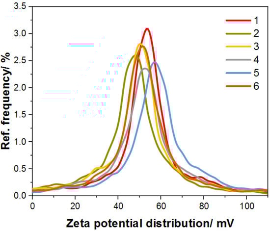 It is known that a suspended colloidal system is stable when the zeta potential values are greater than +25 mV or less than −25 mV [32]. Figure 6 shows zeta potential distribution graphs for all obtained Au@SiO2 samples; it can be seen that they are characterized by a zeta potential greater than +25 mV, resulting from the use of CTAB as a stabilizer, which has a positive charge. In addition, the detailed results of zeta potential measurement are presented in Table 2 [33].