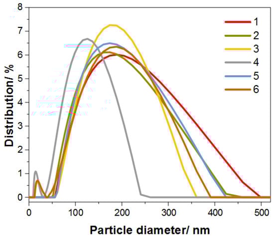 As mentioned earlier, particle size also plays an important role. Figure 7 presents the graphs of the particle size of the obtained nanocomposites, and the detailed measurement results are presented in Table 3. The average particle size is 100 to 200 nm, which is due to the tendency to form larger agglomerates.