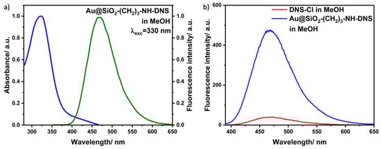 On the other hand, Figure 12b shows selected fluorescence spectra of the Au@SiO2–(CH2)3–NH–DNS nanocomposite in the MeOH solution (blue line) and DNS–Cl in methanol solution (red line), with the same concentration as in the above sample for reference. The measurements for these samples were performed under the same conditions. It is known that the plasmonic fluorescence enhancement or quenching strongly depends on the gold–fluorophore distance [34]. In the case of core–shell nanostructures, the distance between gold and fluorophore can be easily tuned by the silica shell thickness used. In our case, the intensity of the fluorescence spectrum of Au@SiO2–(CH2)3–NH–DNS nanocomposite is about 12 times higher than that of DNS–Cl. The fluorescence enhancement effect results from the electromagnetic interaction of light-excited plasmons located on the surface of the metallic core of the tested nanostructures with connected dansyl molecules [3,18].