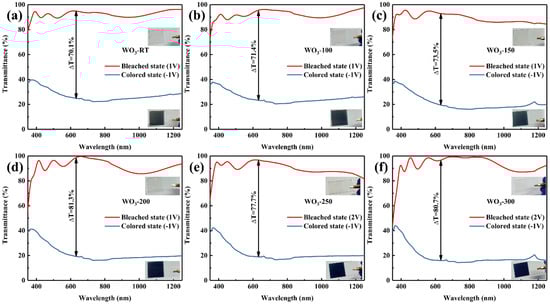 - Chen, Y.; Sun, J.; Huang, Y.; Lin, D.; Ma, D.; Wang, J. Solvothermally grown WO3·H2O film and annealed WO3 film for wide-spectrum tunable electrochromic applications. Ceram. Int. 2023, 49, 29534–29541. [Google Scholar] [CrossRef]