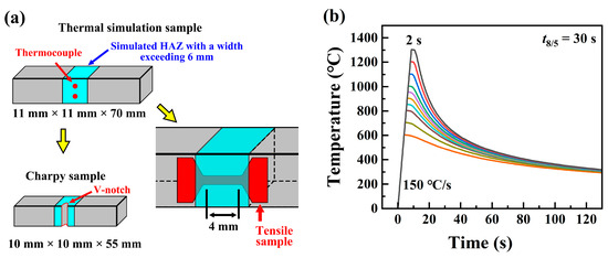 (a) Processing schematic diagram of the thermal simulation samples. (b) Temperature–time curves during the welding thermal cycle.