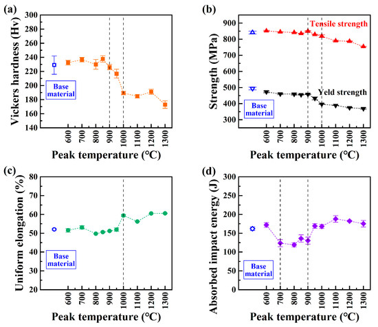 Effect of the peak temperature on (a) the microhardness, (b) yield strength and ultimate tensile strength, (c) the uniform elongation, and (d) the absorbed impact energy at −196 °C of the simulated samples by welding thermal cycle.