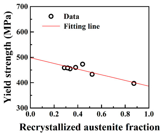 where σy is the yield strength of the simulated sample, fr is the recrystallization fraction, σr is the yield strength of recrystallized grains, and σu is the yield strength of unrecrystallized grains. Assuming that σr and σu are constants, the relationship between σy and fr was fitted based on Equation (1). Figure 7 demonstrates a strong linear relationship between σy and fr. Additionally, the fitted values for σr and σu were 386 MPa and 498 MPa, correspondingly. Thus, it was confirmed that the recrystallization behavior predominated in the variation in yield strength for the simulated samples at a Tp below 1000 °C.