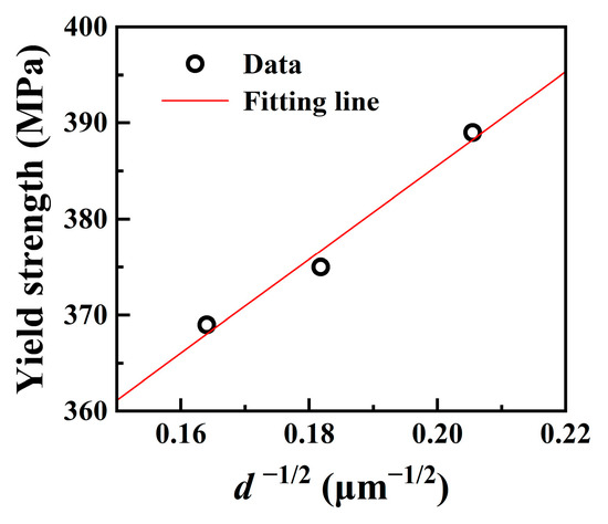 For the simulated samples at the Tp of 1100 °C, 1200 °C, and 1300 °C, the microstructure was fully recrystallized. Here, their yield strength σy is equivalent to σr. The variation in σr meets the Hall–Petch relationship [37]:
