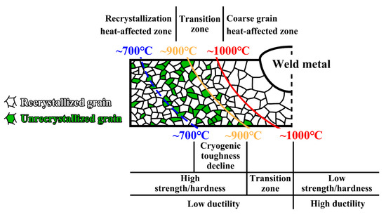 Based on the aforementioned characteristics of the simulated samples in the investigated high-Mn steel, we proposed that the welding HAZ could be divided into three distinct zones. These zones, as illustrated in Figure 9, include the coarse grain heat-affected zone (CGHAZ), the recrystallization heat-affected zone (RHAZ), and the transitional heat-affected zone (THAZ) between the CGHAZ and RHAZ. The CGHAZ was subjected to a welding thermal cycle with a Tp of 1000~1300 °C and was composed of fully recrystallized austenitic coarse grains, characterized by the reduced strength and hardness and good cryogenic toughness. The THAZ experienced the welding thermal cycle with a Tp of 900~1000 °C, and the recrystallization fraction of the THAZ underwent a rapid reduction, resulting in a decrease in strength and hardness. The RHAZ was subjected to the welding thermal cycle with a Tp of 700~900 °C. The microstructure of the RHAZ was composed of partially recrystallized grains, exhibiting high strength and hardness at room temperature and decreased impact toughness at −196 °C. The ductility remained consistent in both the RHAZ and THAZ, and there was a slight increase in the CGHAZ.
