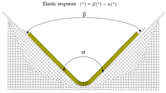 The samples’ outer angles were measured twice using a digital protractor: first right after de-moulding, and then following the trimming process. The elastic response was measured by finding the variance between the interior tool angle (α) and the exterior component angle (β), as shown in Figure 1 and previously done by [5,8,11,12,14,15].