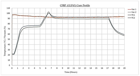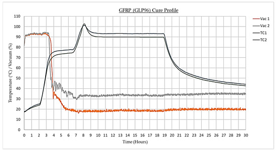 Both materials were exposed to identical cure cycles with dwell periods at 75 °C and 90 °C and a recommended pressure of 90,000 Pa (Figure 4). However, as presented in Figure 5, during the fabrication of the GFRP samples, the vacuum pressure decreased after 3 h. This was caused by the bag sealant melting, leading to the unwanted influx of air. To overcome this issue, an additional FEA simulation (simulation three) was developed to accurately model the realistic manufacturing process.
