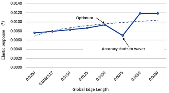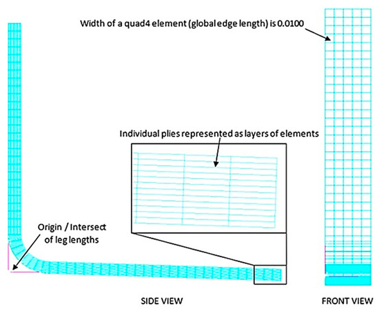 In the pre-processing stage, CAD models were converted into shell elements. The outer surface of the ‘L’ components was meshed into a series of quad-4 elements and subsequently extruded across the laminate thickness whilst segmenting individual layers [20] shown in (Figure 6). Duplicate nodes were then removed, and element coordinate systems were adjusted to align with the component contours. By completing a mesh convergence analysis, an optimal global edge length (0.0100) could be achieved [21] as shown in Figure 7 and Figure 8.
