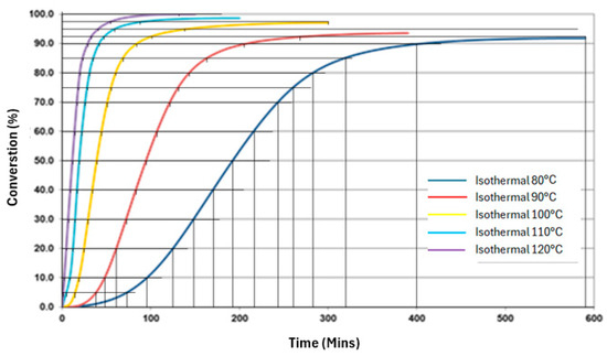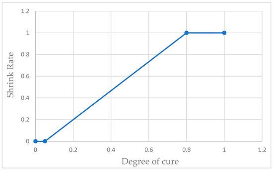 To begin, the material properties were entered into an analytical tool; shrinkage in volume, exothermic reaction, and rate of cure were controlled graphically, as shown in Figure 9 and Figure 10 [17,22]. The internal program automatically translates this tabular data into workable equations.