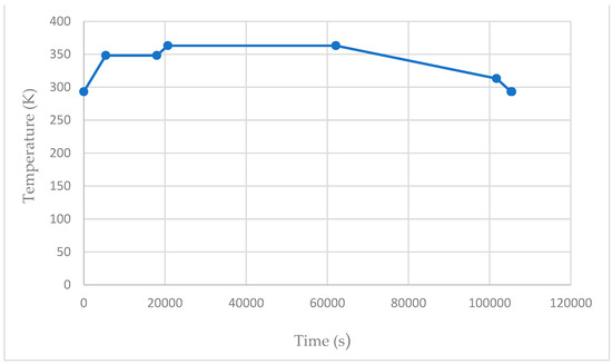 Next, a face load of 90,000 Pa was applied to all exterior elements and assigned to load case 1 (replicating the vacuum pressure) whilst a time-dependent temperature (Figure 11) was enacted upon all nodes and allocated to load cases 1 and 2. These temperature measurements reflect the radiation emitted by the cavity and simulate the ideal manufacturing conditions (Figure 4). The emissivity for both materials was allocated a value of 1 to guarantee effective heat absorption.