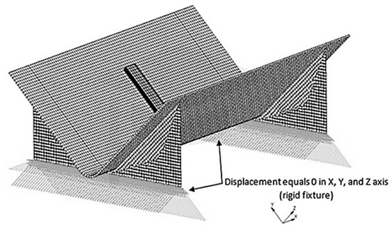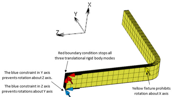 Penultimately, components were constrained using nodal fixtures [23]. In load case 1, to restrict displacement, the exterior nodes were rigidly constrained in all directions. In load case 2, constraints were applied to restrict translation but allow thermal expansion and the generation of bending moments (Figure 12). An initial degree of cure (0% a minute) and starting oven temperature (20 °C) were then applied to define the first time-step.