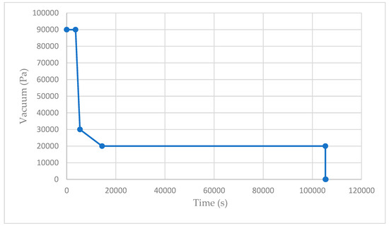 Since the GFRP samples were manufactured with a diminishing vacuum (Figure 5), the initial FEA results did not align with the experimental data. As a result, a third simulation was developed to accurately mimic the real-life fabrication. While all other boundary conditions remained consistent with simulation two, there was a specific alteration made to the vacuum pressure. In this case, the vacuum pressure was modified to decrease from 90,000 Pa to 20,000 Pa over a period of three hours, as presented in Figure 14.