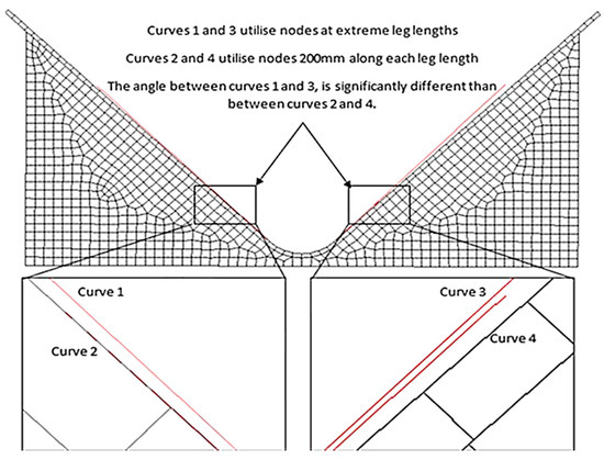 Unfortunately, as the curve length increased, the exterior angle and subsequent elastic response decreased (despite the time step and geometry remaining constant). This was due to the leg lengths of the composite product deforming more at their extremities. Subsequently, curves using these nodal positions had different vectors, highlighted in Figure 15.