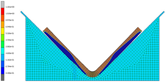 By evaluating this project’s most successful simulation (part 8010-2K, simulation three), the origins of elastic response were determined. The normal stress and volumetric cure shrinkage infer a significant correlation (Figure 17 and Figure 18), verifying that the residual stress is due to the phase change from an amorphous to a crystalline molecular structure [5,6,8,11,16,17]. Figure 18 and Figure 19 demonstrate that the interface between the tooling and composite hinders the cure rate of the adjacent resin due to the heat-conducting properties of the metallic material leading to a reduction in kinetic energy. The finite element analysis results also indicate that plies near the tool show a negative shrink in volume (Figure 18), causing a negative state of stress (Figure 17). This occurrence is explained within other studies [6,8] where authors mention that plies located at the interface expand during the process of curing due to the viscous state of resin. This expansion generates an in-plane stress that extends across the entire thickness of the laminate [6,8].