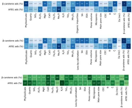 - Calculate the Spearman’s score (ρ) between each individual physico-chemical property (x) and the adsorption of AFB1 mycotoxin or β-carotene (y) by Equation (4).