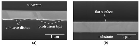 Prior to bonding, Cu surface roughness was assessed by conducting atomic force microscopy (AFM, Bruker Dimension Icon Scanning Probe Microscope (ICON), Bruker, Billerica, MA, USA) measurements over a 10 × 10 µm2 scan area. Before and after the bonding and annealing processes, the samples were subjected to grinding and polishing. Cross-sectional specimens for scanning electron microscopy (SEM) analysis were then prepared using focused ion beam (FIB, Helios NanoLab 650, FEI, Hillsboro, OR, USA) techniques, facilitating detailed observation and characterization of the voids and interfaces in the samples. The cross-sectional SEM images of the surfaces are shown in Figure 1, revealing that the F surface appeared very flat, while the W surface exhibited protrusion tips and concave dishes. The samples were then bonded together at room temperature. A schematic illustration of the bonded interface, based on the cross-sectional SEM images of the W and F surfaces, is depicted in Figure 2.