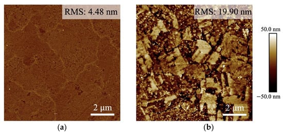 The surface roughness of the Cu samples was assessed using atomic force microscopy (AFM). The root mean square (RMS) value for the F surface was determined to be 4.48 nm, while for the W surface, the RMS value measured 19.90 nm, as shown in Figure 3. After the wet-etching process, the W surface exhibited increased roughness, with a notable rise in the RMS value.