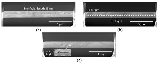 BF is determined by assessing the ratio of the projected bonded/contact regions to the “interfacial length” (15 µm), as shown in Figure 4a. Void fraction (VF) is determined by comparing the void areas to the areas surrounding the interface (0.3 × 15 µm2), as illustrated in Figure 4b. VH represents the vertical extent of the voids, as depicted in Figure 4c.