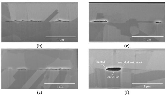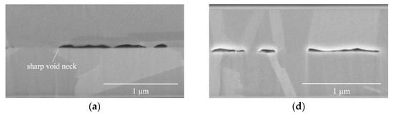 Furthermore, as Cu atoms diffuse from the flat surface (F surface) towards void necks, certain F surfaces experience a change in their radius of curvature (Rflat) from infinite to negative or faceted, thus forming lenticular and faceted voids, as shown in Figure 5f. These observations align with the findings of Gondcharton et al. [30], who conducted a study on Cu–Cu bonded structures. This diffusion process occurring at the “F surface” also contributes to the observed increase in VH.