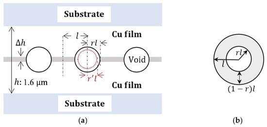 where J is the creep flux, D is the diffusivity of Cu, is the actual stress at the contact area, k is Boltzmann’s constant, T is the temperature, and l represents the average distance between the center of a bonded region and a void region (as illustrated in Figure 6).