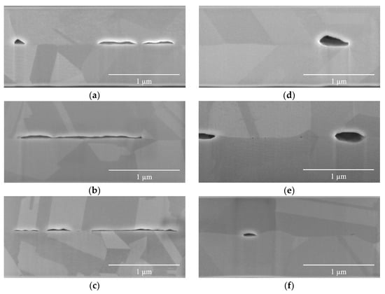 This observation holds true for and as well. The bonding mechanism in these two cases was primarily governed by deformation. As indicated by the data presented in Table 2, was 44.4–88.8 nm, which was higher than (24.4–57.5 nm). However, (44.4–158.6 nm) was higher than and . This can be attributed to a change in the bonding mechanism to diffusion, as evidenced by the rounded neck and lenticular shape of M5B250t1 voids depicted in Figure 5f.