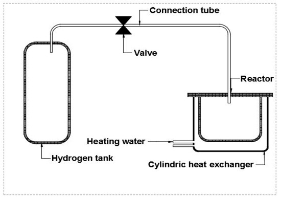 The volumetric method was used to measure hydrogen absorption isotherms [68]. Its principle is as follows: A metal hydrogen reactor (MHR) with high pressure was filled with 20 g of the prepared material and connected to a hydrogen tank of buffer volume via Swagelok valves and aluminum connection tubes. During absorption, the hydrogen tank was charged to the desired pressure (P0) and placed in contact with the reactor. The hydrogen pressure decreased in the tank until it reached an equilibrium value (Peq). A pressure sensor was installed within the hydride bed, coupled with an Agilent acquisition card and a microcomputer, allowing the control of the temporal evolution of the pressure of the absorbed hydrogen. The temperature inside the hydride bed was regulated by cooled water from a thermostatic bath through an external cylindrical heat exchanger (Figure 1).
