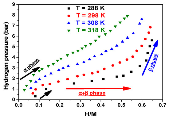 The hydrogen capacity, i.e., concentration, is commonly expressed in terms of atoms of hydrogen per metal species, i.e., H/M. It is most effective to use the its highest capacity [H/M]max to characterize the metal hydride. The following could serve as a summary of the key findings pertaining to the acquired outcomes. It is seen from Figure 2 that at a given temperature, an isotherm is composed of three phases:
