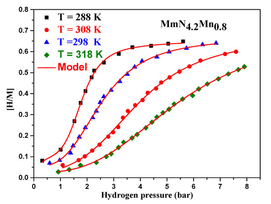 Using the model previously described, the hydrogen absorption isotherms were adjusted. The adjustment demonstrates that the suggested model and the experimental data agree perfectly (Figure 4).