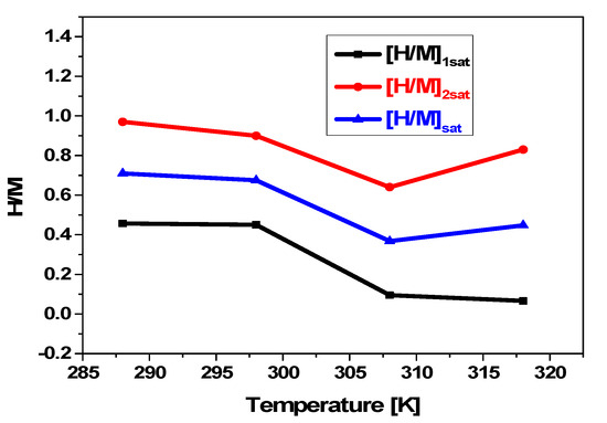 The evolution of [H/M]1sat, [H/M]2sat, and [H/M] sat of the absorption reaction depending on temperature is depicted in Figure 7.