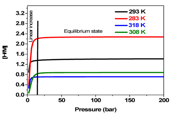 Pressure affects the process of hydrogen absorption significantly, just like temperature does. It is one of the most important factors to take into account when developing and perfecting hydrogen storage systems. The [H/M] variation as a function of applied pressure versus temperature is shown in Figure 9.