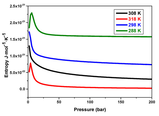 Thefindings demonstrated that, at a specific temperature, the absorption reaction’s entropy crosses a maximum (a pic). Throughout the absorption reaction, the disorder progressively rises, reaches its highest point near the equilibrium state, and then eventually drops and maintains stability, indicating that the reaction has attained its state of equilibrium. The entropy’s maximum is found to decrease with rising temperatures. This can be attributed to the endothermic character of the reaction.
