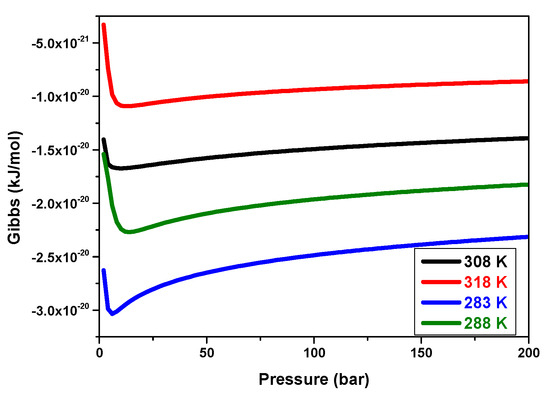 5.3.8. Effects of Pressure on the Gibbs Variation versus Temperatures