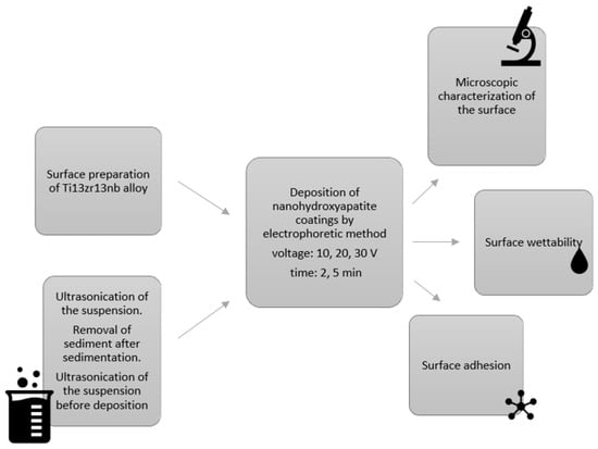 The electrophoretic deposition method was used to deposit nanohydroxyapatite coatings on Ti-13Zr-13Nb alloy. The titanium samples had the shape of a cylinder with a diameter of 20 mm and a height of 3 mm. The samples were ground with abrasive paper SiC up to grit #2500. Distilled water was used to wash the samples after grinding, and then the surface was dried with compressed air.