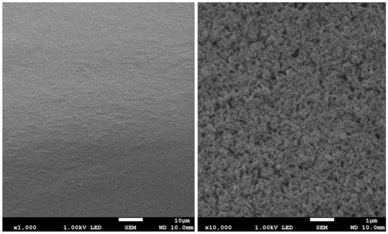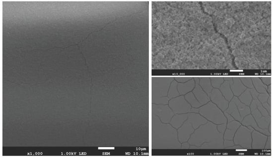 The results of surface imaging using SEM are shown in Figure 2, Figure 3, Figure 4, Figure 5, Figure 6 and Figure 7. No agglomerates of hydroxyapatite nanoparticles were visible on any of the coatings. All coatings are homogeneous. The coatings obtained at a voltage of 10 V were homogeneous and continuous regardless of the deposition time. The increase in voltage caused cracks to appear on the surface.