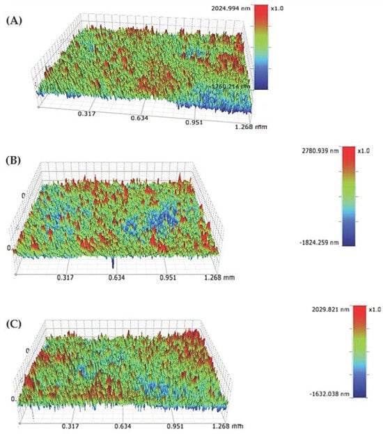 Topographic data from optical profilometry showing surface roughness. (A) nHAp10/2, (B) nHAp20/2, and (C) nHAp30/2.