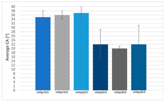 Wettability tests were performed using the Attention Thete Lite goniometer. The average value of CA (after 10 ± 0.07 s) is presented in Figure 10. All coatings are hydrophilic and the mean contact angle values are in the range of 20–37. The lowest average CA was obtained in the case of nHAp30/2 (20 ± 1) and the highest was found in the sample nHAp20/2 (37 ± 3). Contact angle values are comparable to those reported in the literature. Bartmański et al. deposited HAp (on the same titanium alloy) at a voltage of 30 V for 2 min and the value of the contact angle is about 35.8° [33].